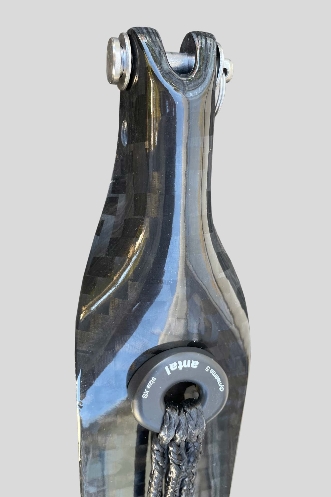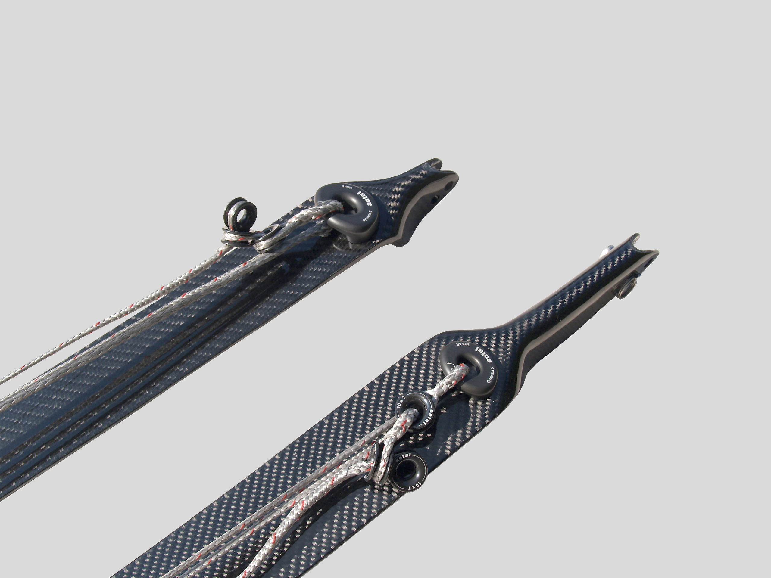 Die Federstärke variiert je nach Bootsgröße. Der Kicker wird mit einer Dyneema Kaskaden Talje 1:16 und leichten Alu Ringen fertig montiert geliefert. In Carbon Design, hochglanzpoliert weiß oder schwarz macht er sowohl auf Daysailern, Drachen, H-Booten oder Jollenkreuzern eine gute Figur.
