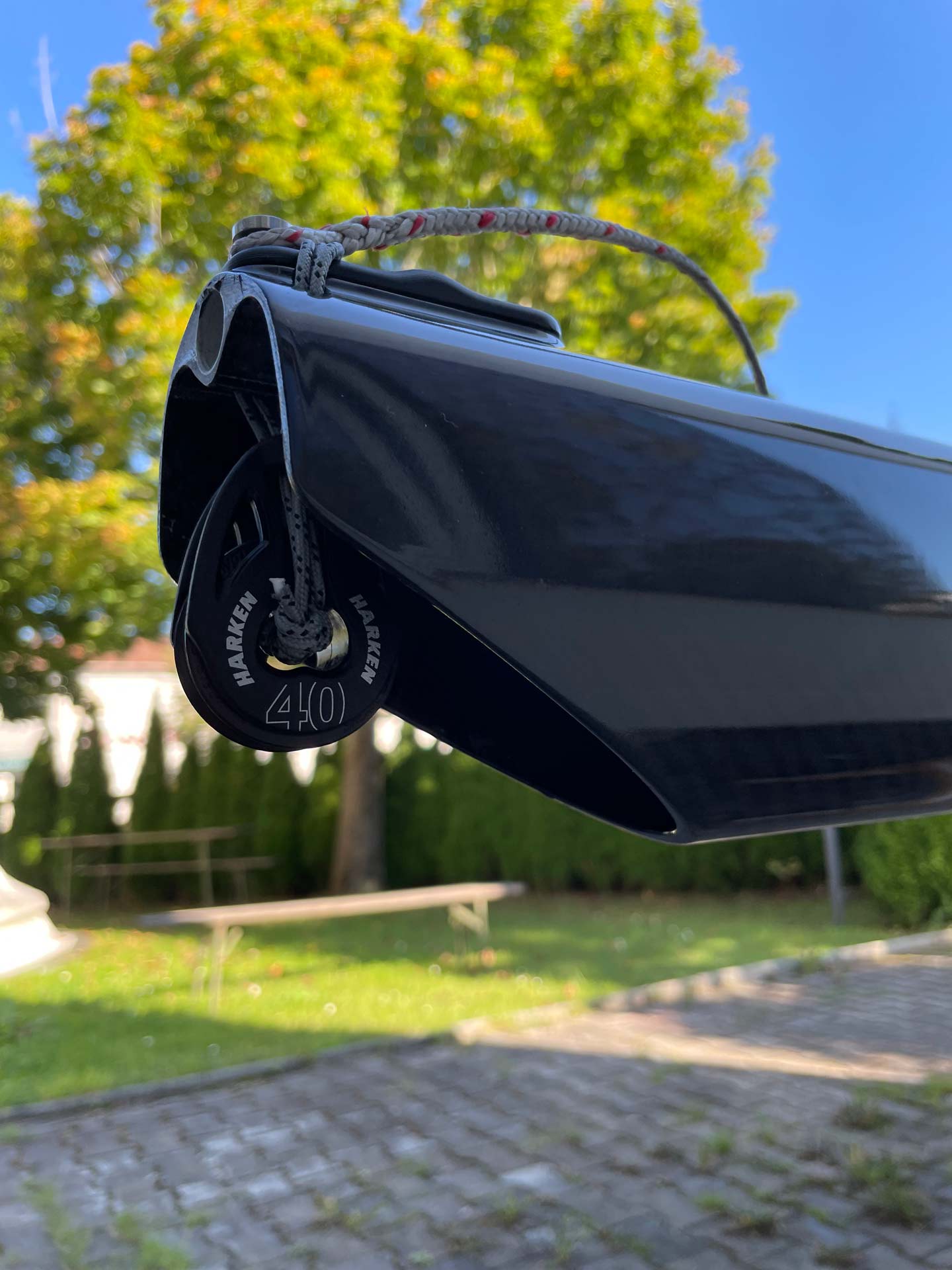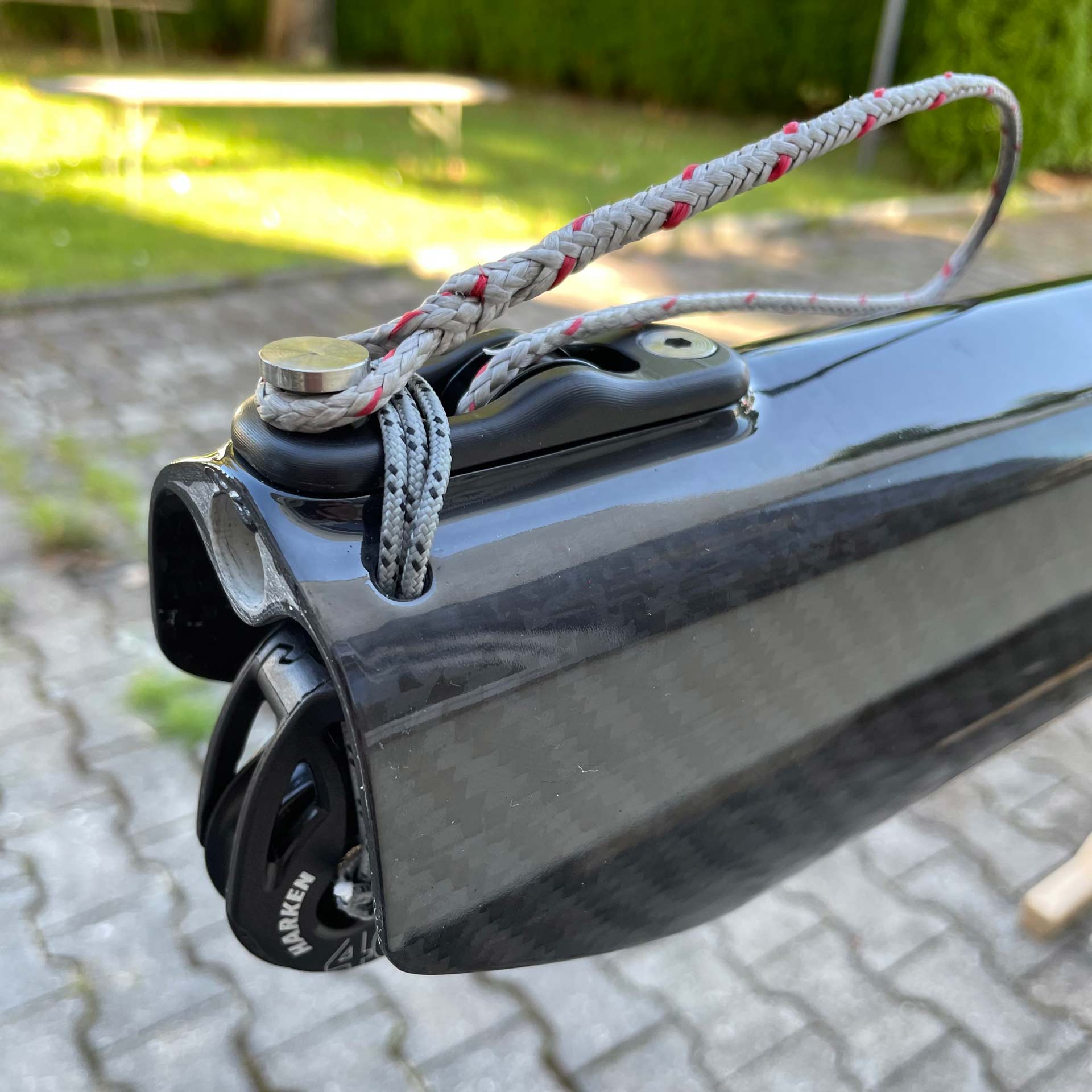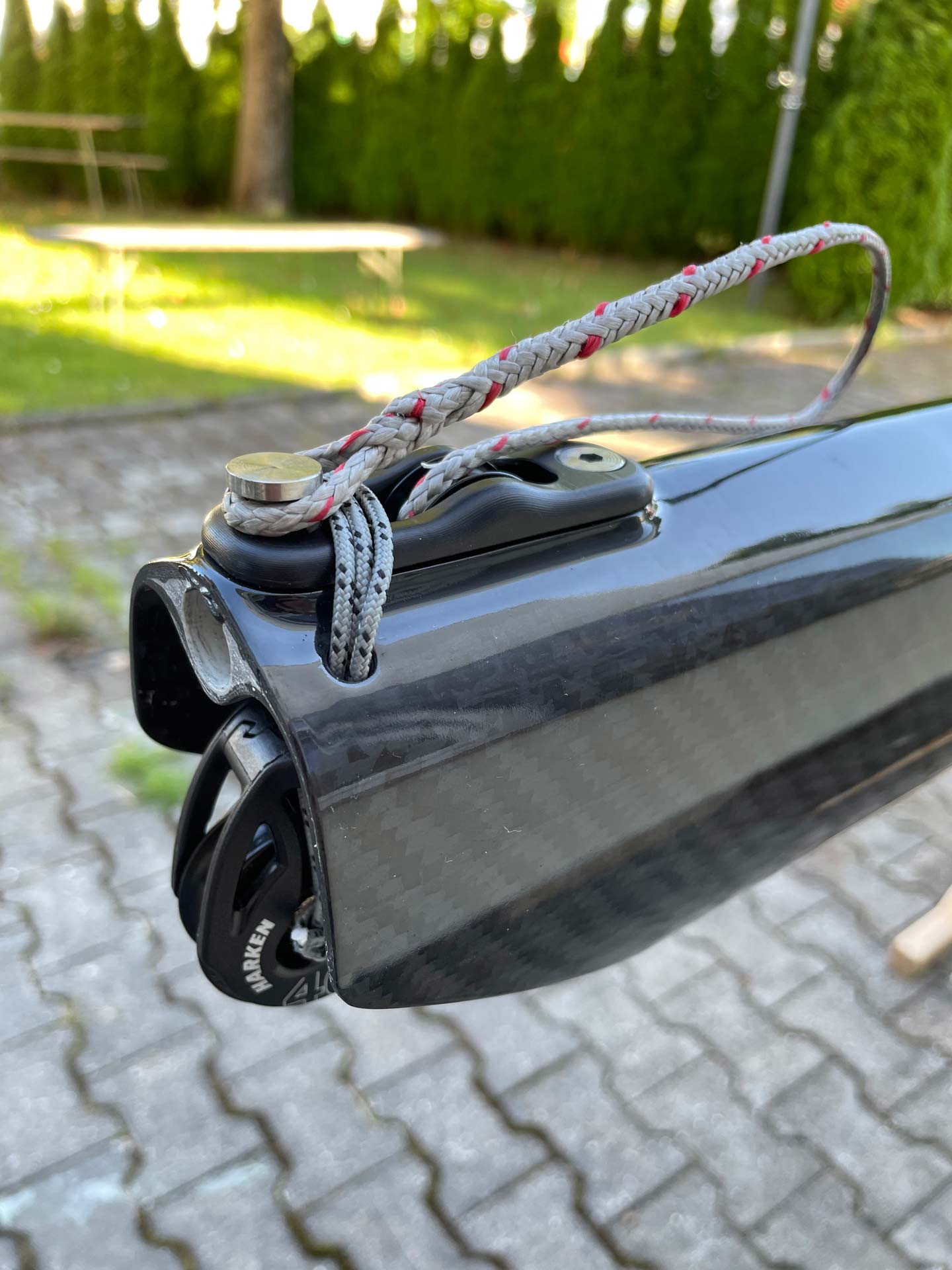 Für die neue Foiling Innovation aus Österreich haben wir einen leichten Carbon Großbaum gefertigt. Am Baum sind vorne zwei Klemmen für Unterliek und Verstellung des Drehmastes integriert. Diese können vom vorderen Cockpit Platz perfekt bedient werden. Alle Beschläge, wie bei uns üblich, leichtgängig und optisch dezent integriert.